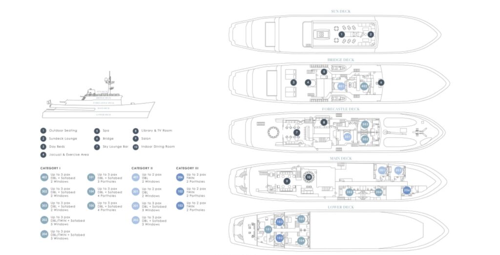 Further communal areas unfold across the upper decks: the forecastle deck offers a library, TV room, and the sky lounge bar, leading out to alfresco dining and shaded seating. On the bridge deck, guests will find the spa and Jacuzzi, while the sun deck above provides a large lounge bench and sun loungers for long, unhurried afternoons at sea.