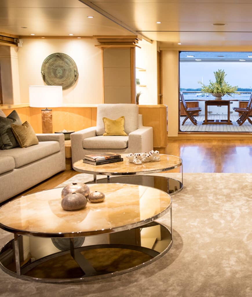 Aqua Blu’s main deck is arranged around an expansive indoor salon and dedicated dining room, with a relaxed outdoor lounge on the aft. The atmosphere is contemporary yet warm: polished surfaces, soft fabrics, and wide windows creating spaces that feel open and considered.