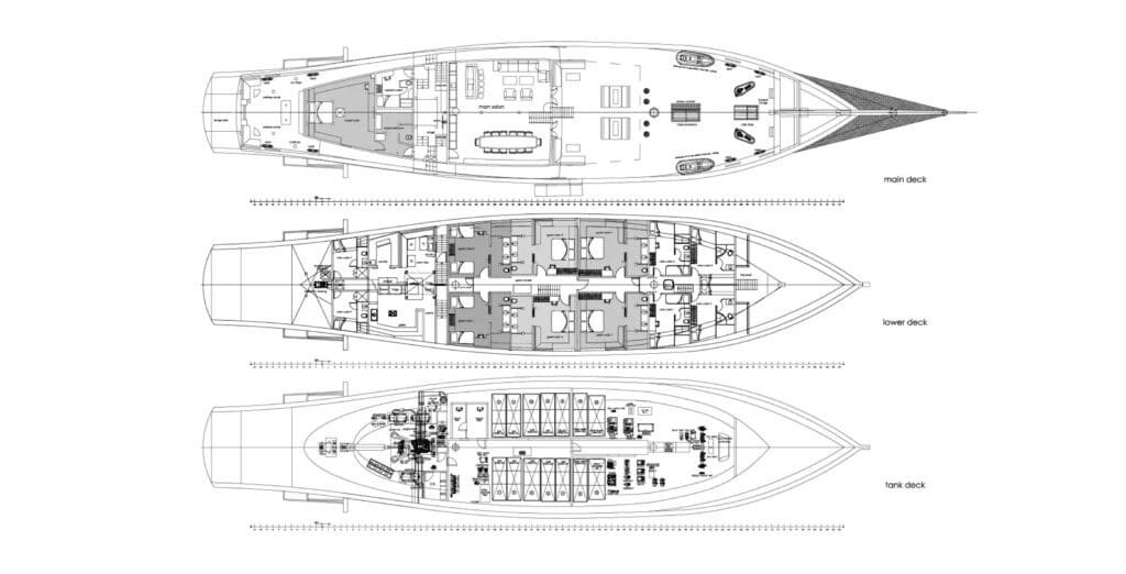 Lamima accommodates up to fourteen guests in seven air-conditioned suites, each spacious and light-filled with a refined mix of Indonesian character and contemporary design. An opulent master cabin anchors the layout, complemented by four double suites and two twin cabins, all with comfortable lounge areas and ensuite bathrooms.