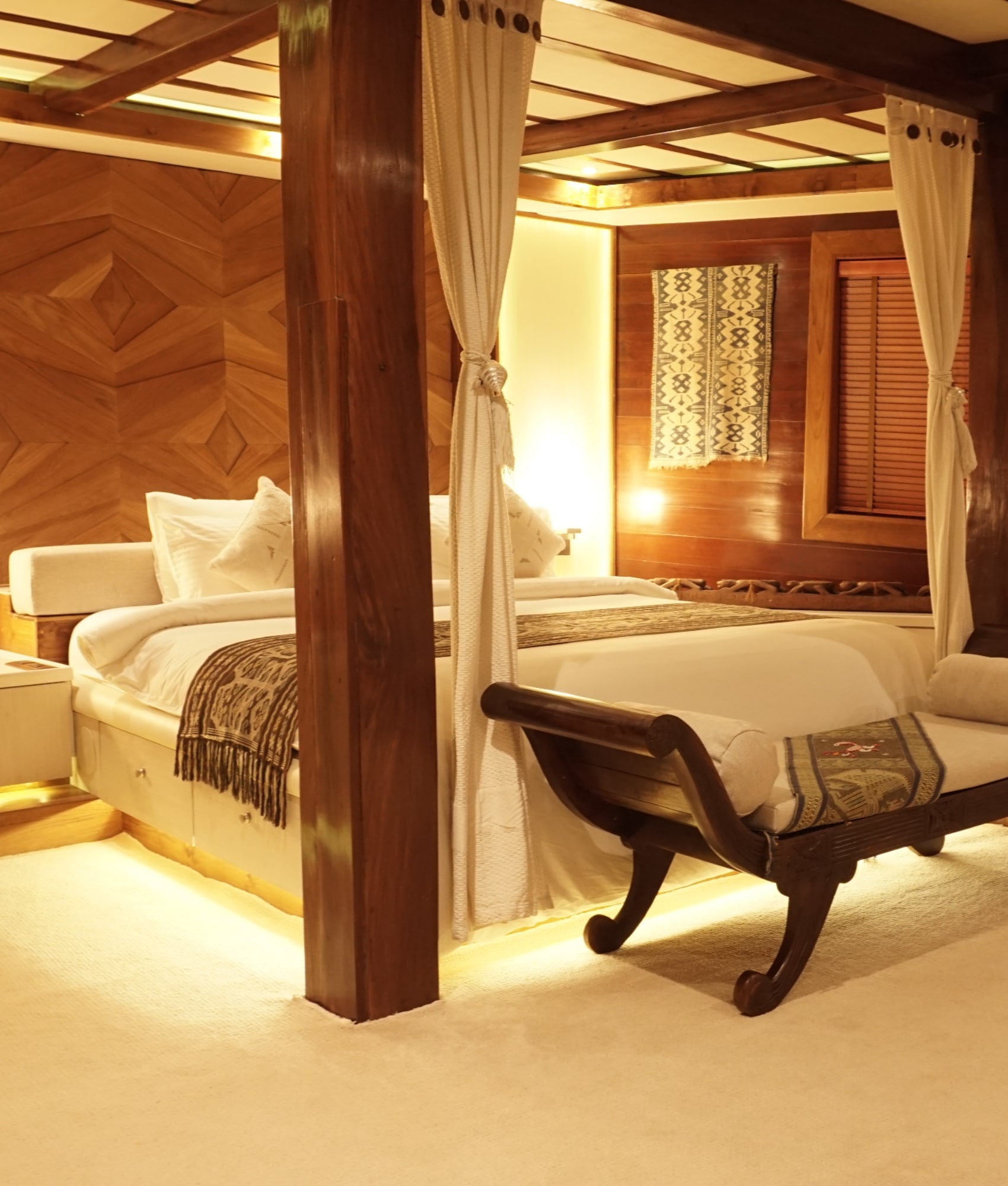 Subtle lighting, smooth teak, and natural textures create an atmosphere that feels open yet grounded. WiFi, HD televisions, and integrated sound systems bring modern convenience, while Indonesian artworks and textiles lend a quiet sense of place.