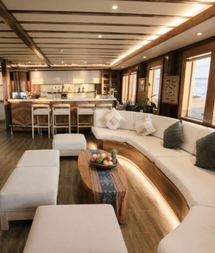 Above, the upper deck features panoramic views, sun loungers, and a dedicated wellness area where yoga and massage sessions take place in the open air. A qualified spa therapist offers treatments rooted in traditional Indonesian techniques, creating moments of renewal between adventures.