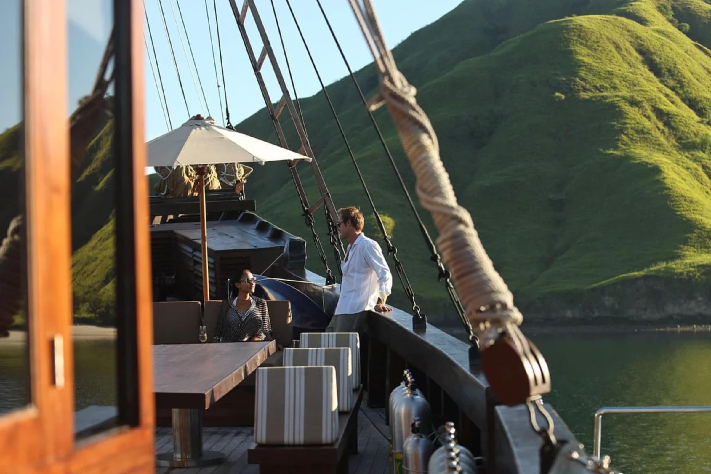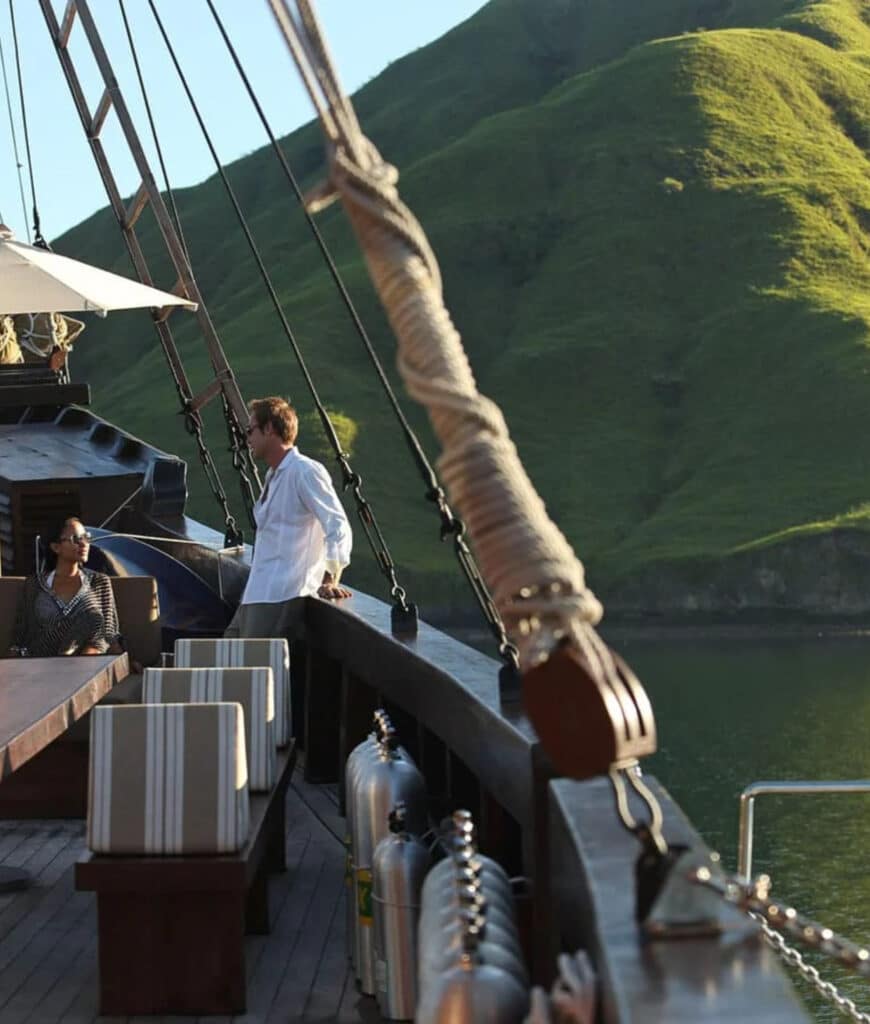 Above water, rolling hills, savannah grasslands and quiet inlets create a shifting palette of ochres and greens. Beneath the surface, nutrient-rich currents support manta rays, coral gardens and thriving marine life, making Komodo one of Indonesia’s most varied cruising grounds.
