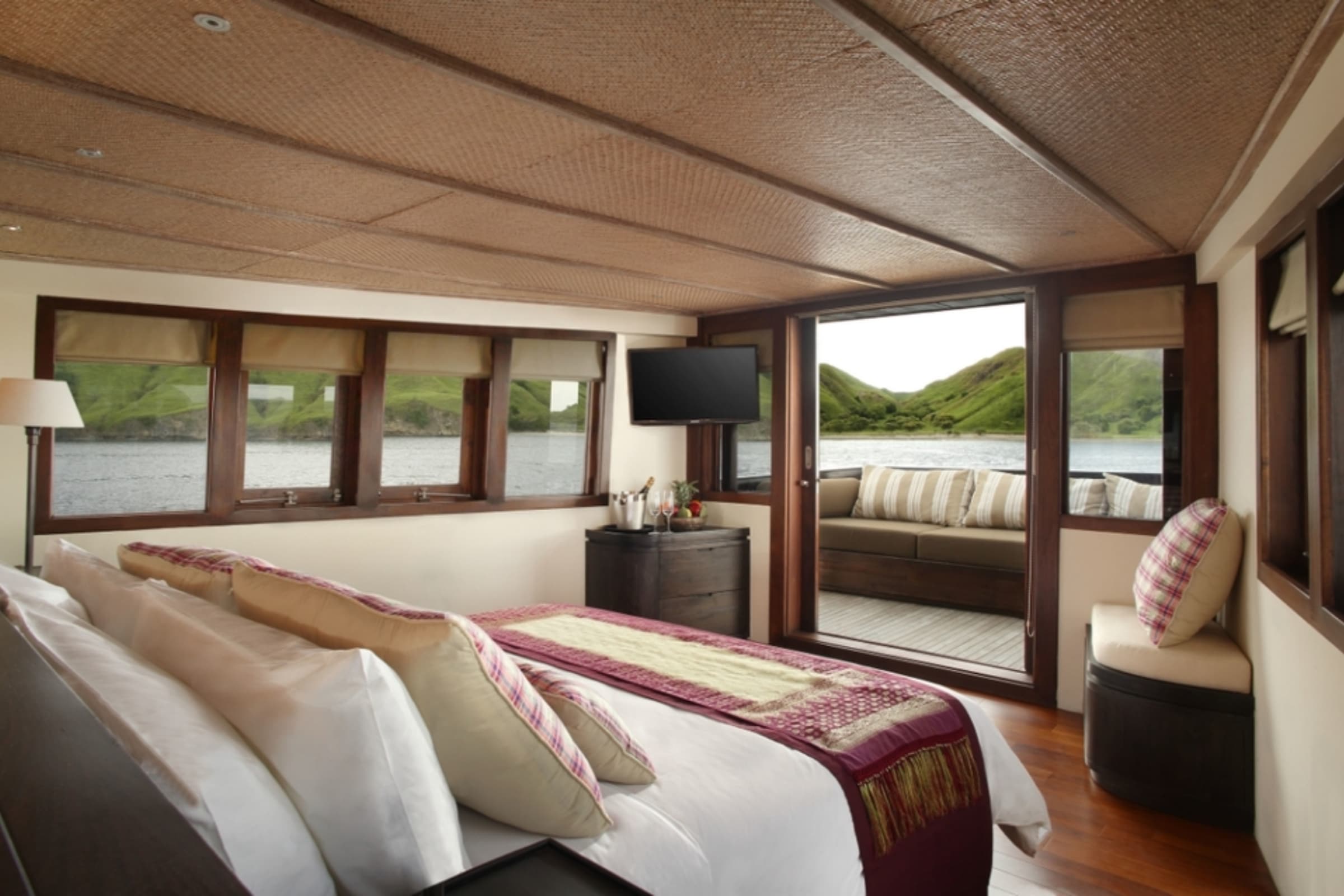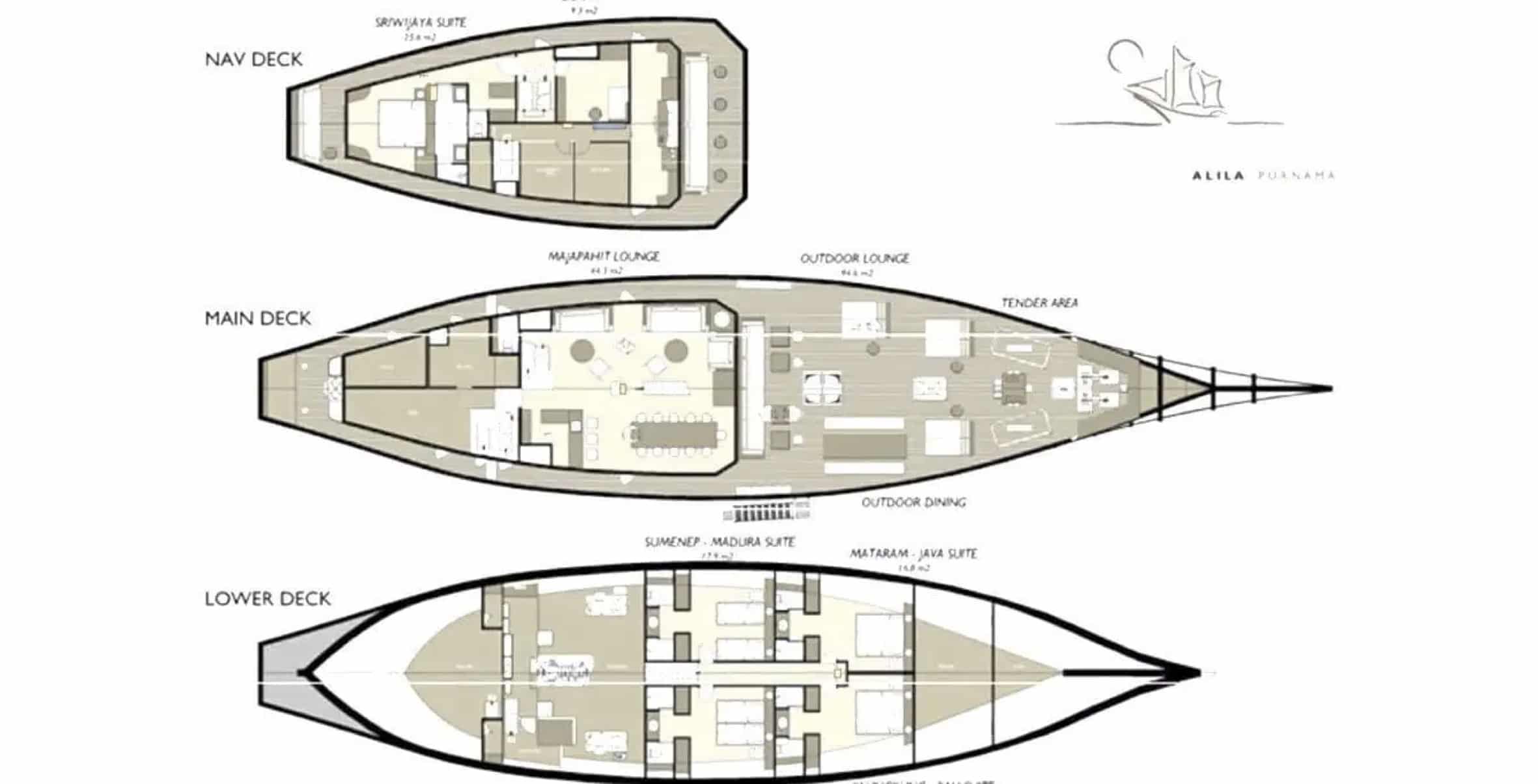 Below deck, four suites each feature a queen-size bed, double wardrobes, writing desk, and ensuite bathroom. Natural materials such as rattan and teak lend warmth and authenticity, while locally crafted furnishings and custom detailing echo the Alila philosophy of sustainable design.
