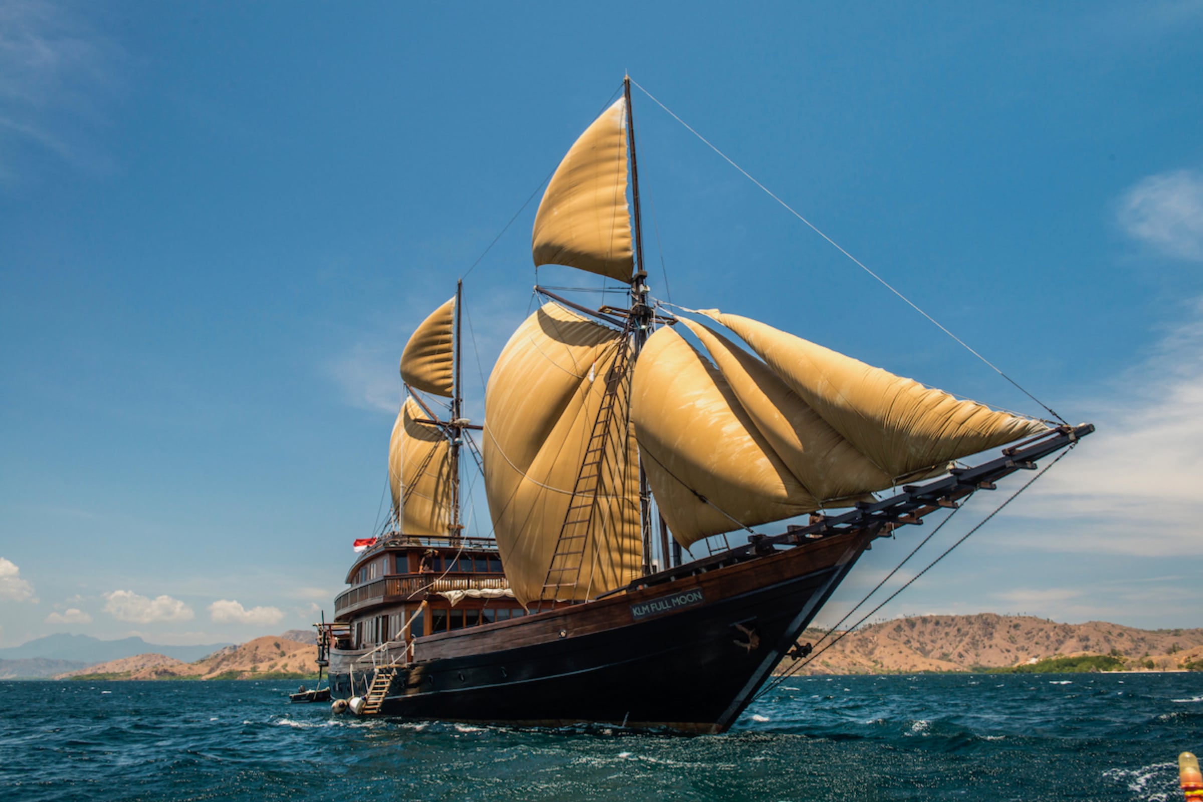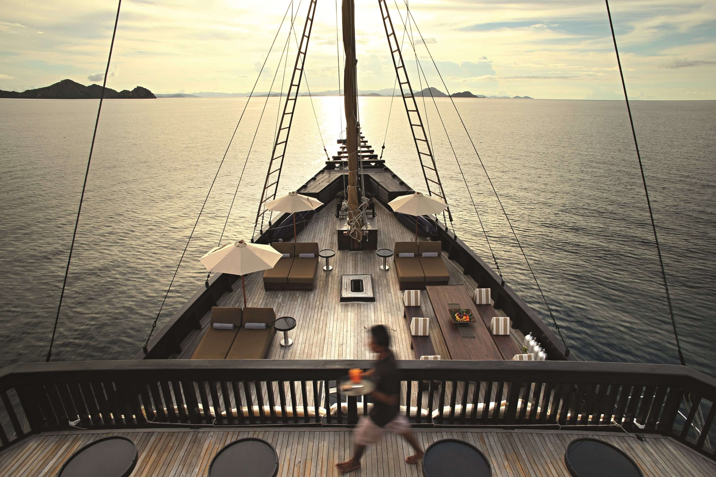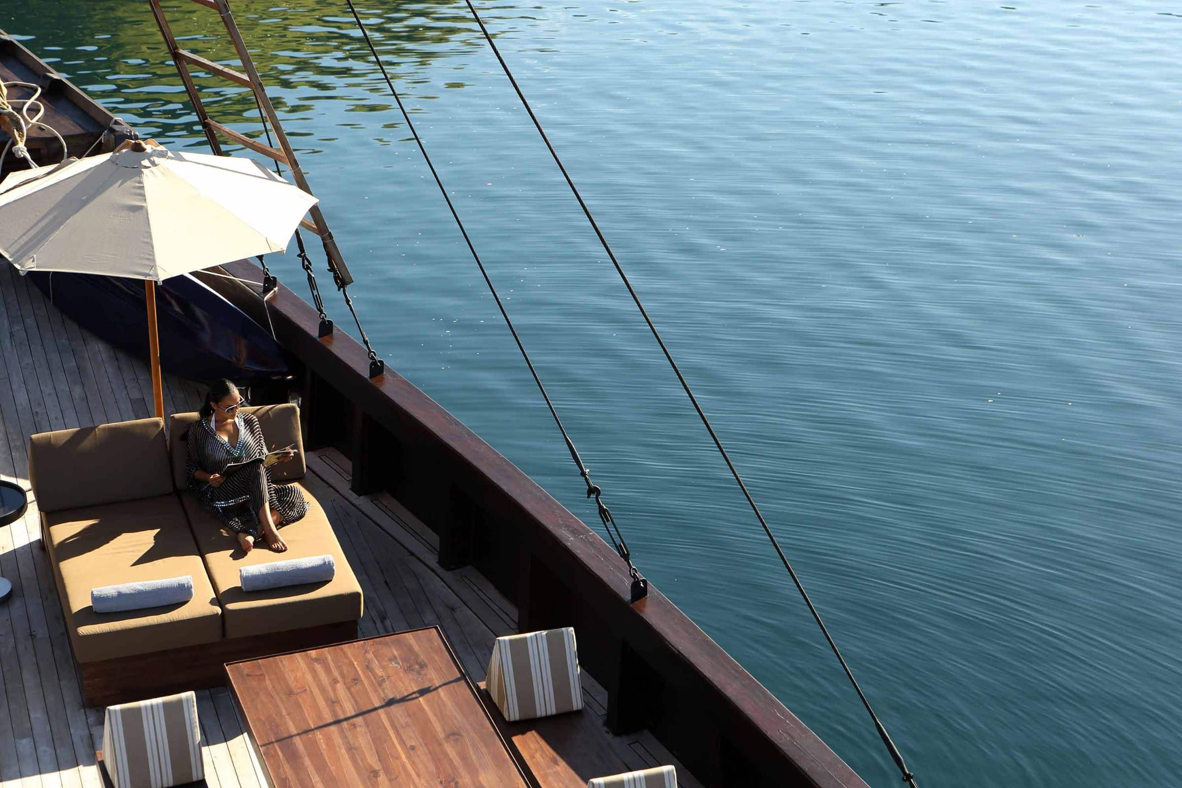 Alila Purnama can be chartered at anytime of year, as Indonesia is a year-round cruising destination. The location will depend on the season.