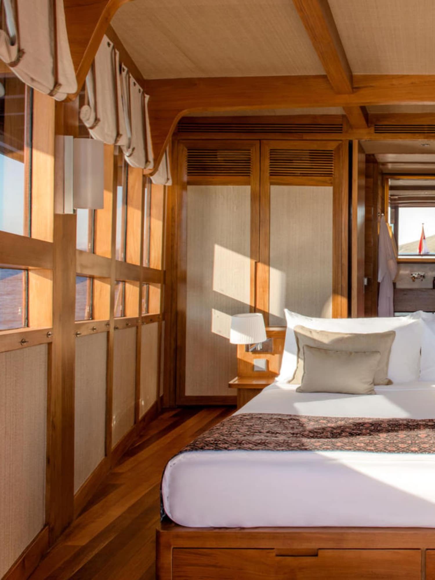 Amandira accommodates up to ten guests across five suites designed in Aman’s signature palette of cream, fawn, and caramel tones. Each cabin blends warm teak with soft textiles, creating an atmosphere of calm and understated luxury.