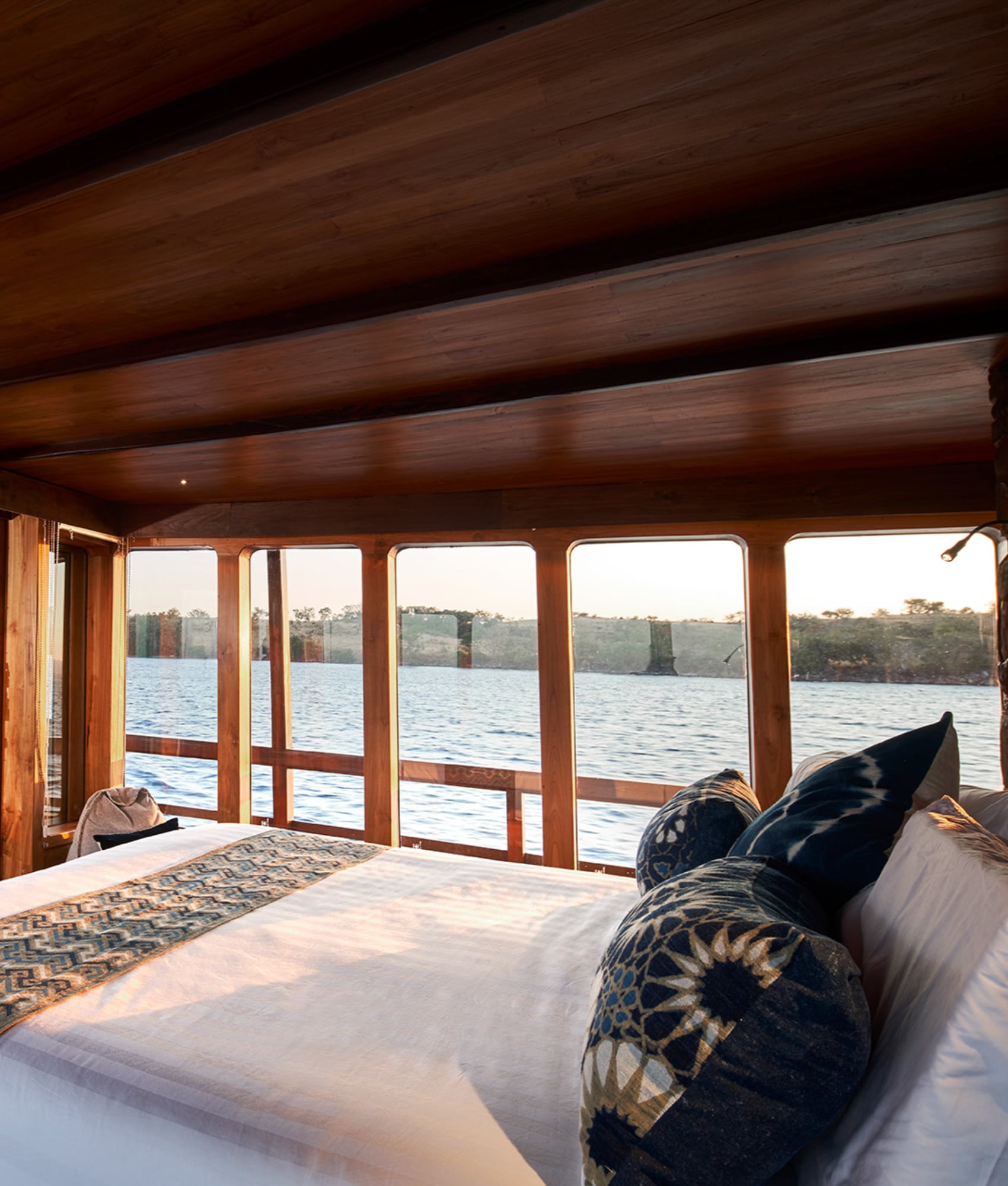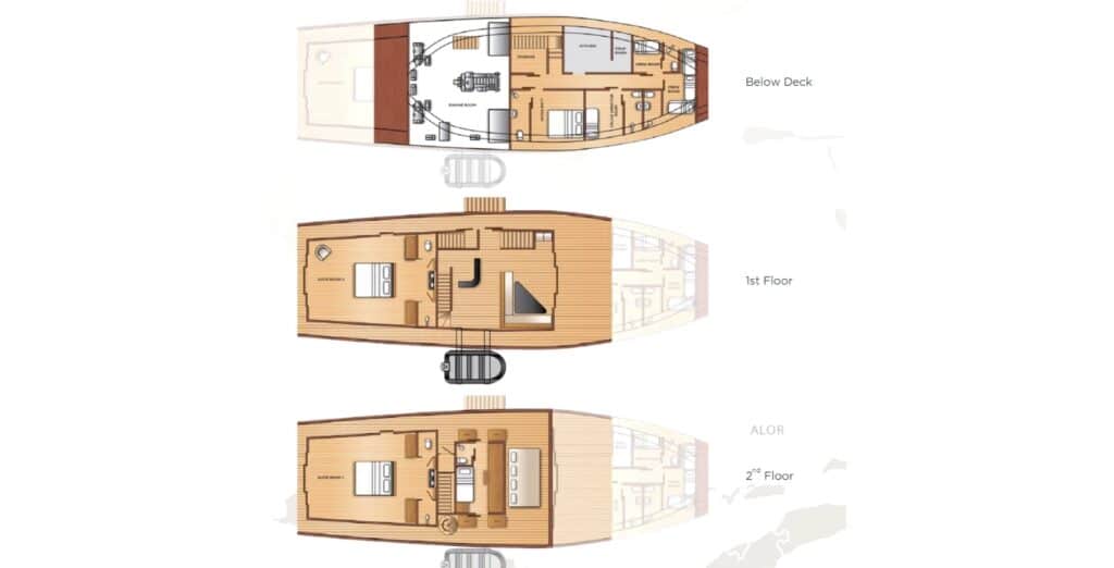 Le design est réfléchi et serein, avec des matériaux naturels, des textiles doux et des tons chauds qui reflètent l'héritage indonésien du yacht. Les systèmes Sonos, le mobilier contemporain et l'éclairage subtil ajoutent au confort sans excès, créant des suites calmes, intimes et magnifiquement pensées.