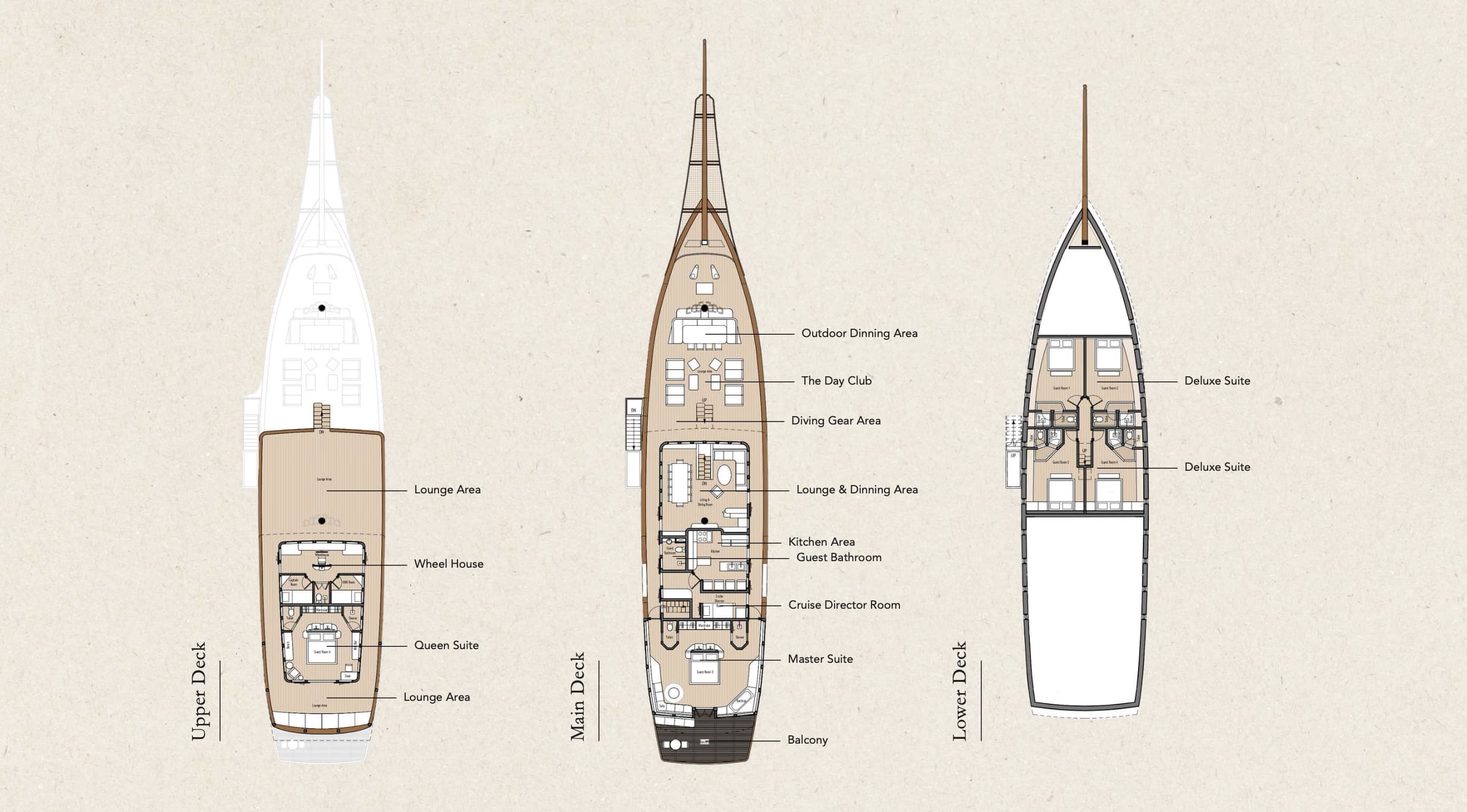 Four Deluxe Staterooms on the lower deck continue Otium’s tropical-modern aesthetic, with queen beds, porthole views and tranquil ensuite bathrooms. Natural light, handcrafted woods and a soft neutral palette create interiors that feel calm, inviting and connected to the sea.