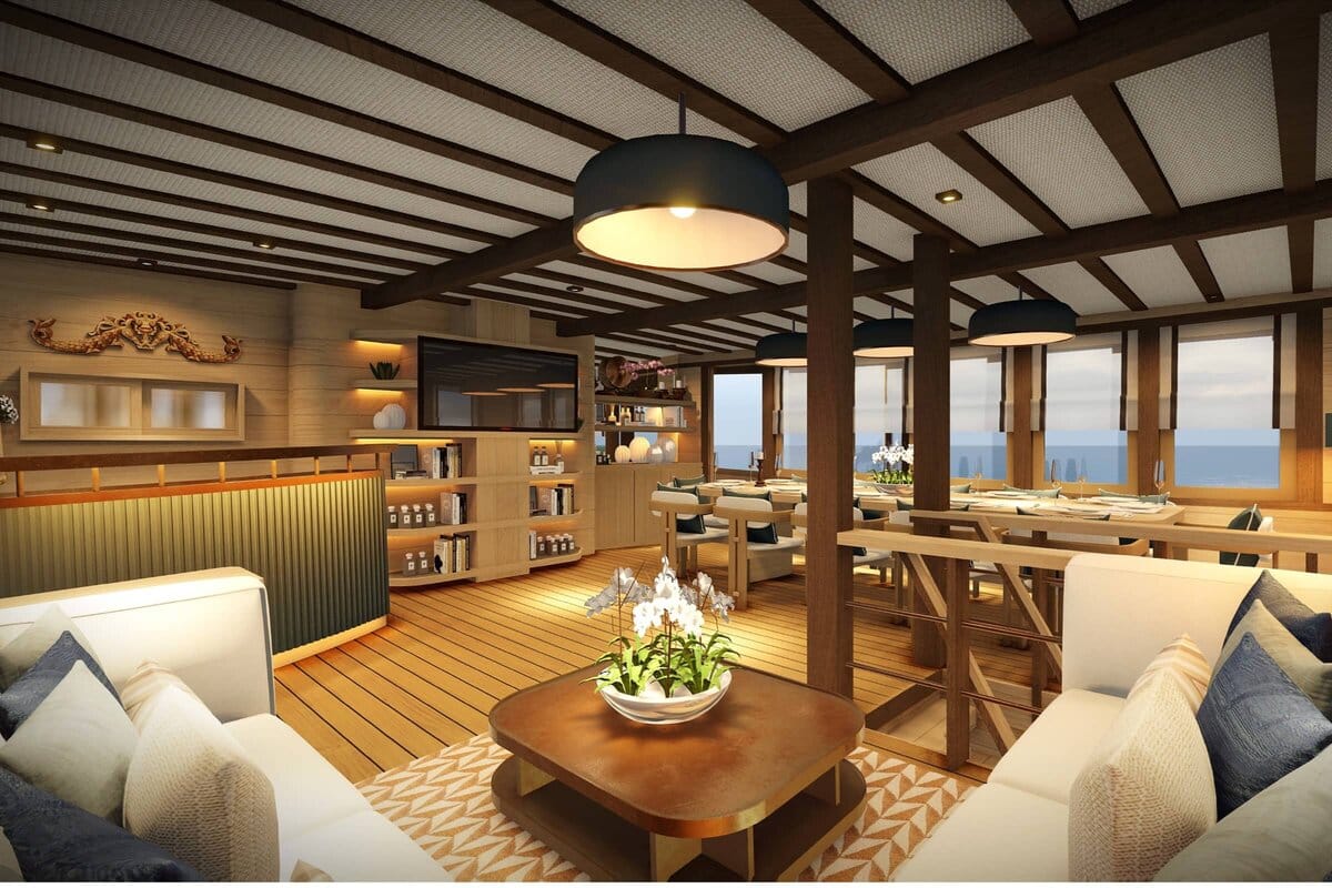 Life onboard flows naturally between indoor comfort and expansive open-air decks. The 45-square-metre Day Club, Otium’s signature sundeck, offers sun loungers, shaded seating and an alfresco dining area ideal for relaxed afternoons or dinners beneath the stars.