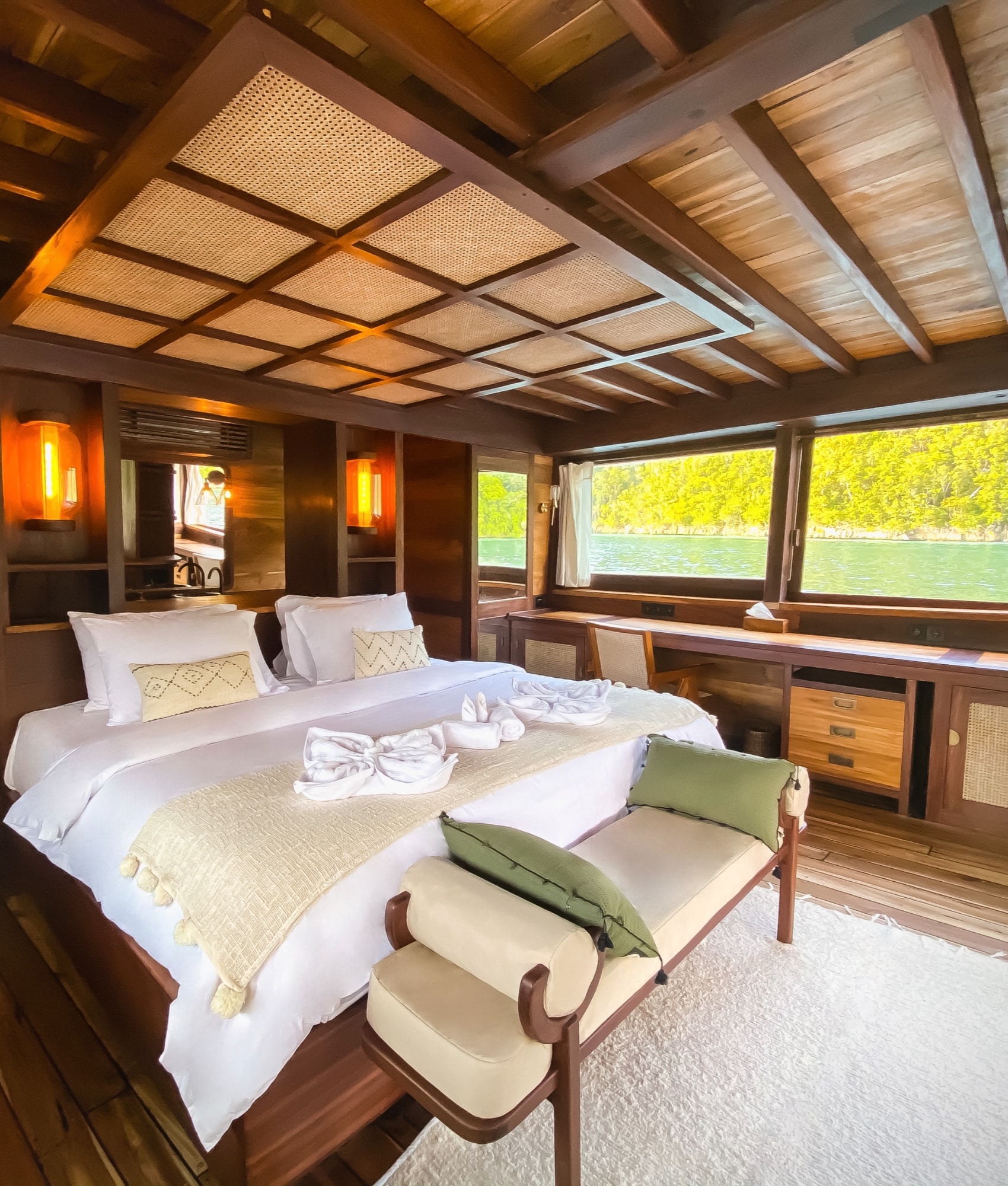 Senja accommodates two to four guests across a master suite and a flexible additional cabin. The master cabin sits on the main deck with air-conditioning, an ensuite bathroom and wraparound windows that fill the space with natural light. Neutral textiles, warm wood and soft tones create an airy, elegant retreat.