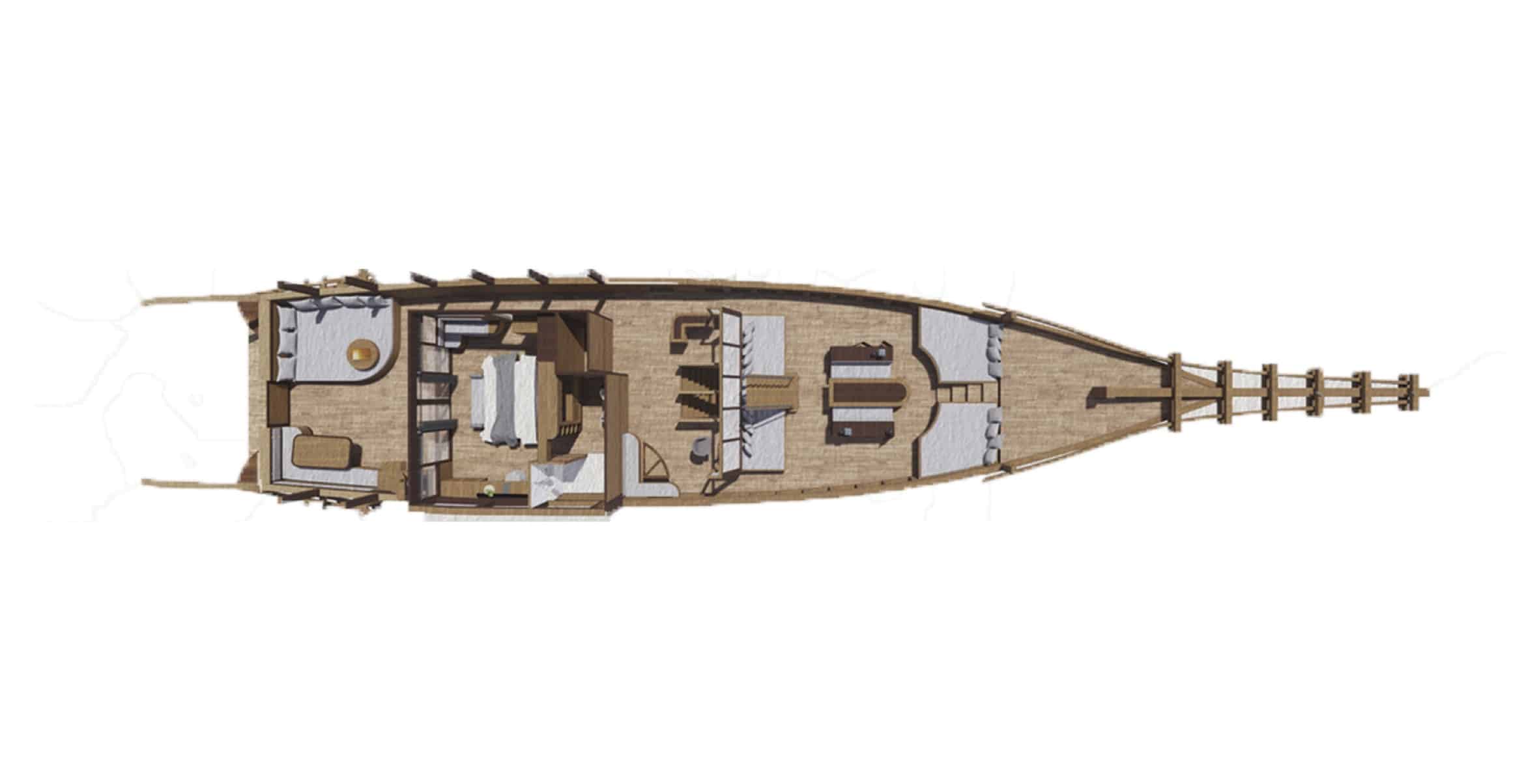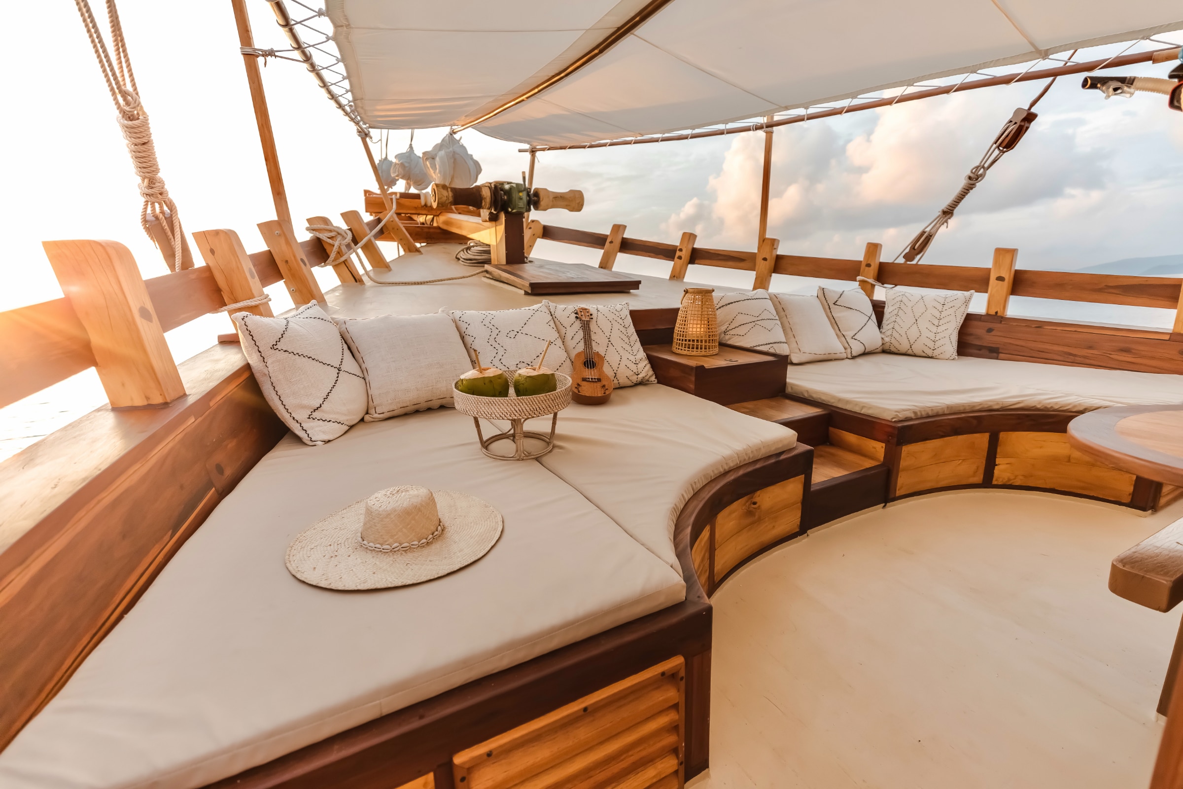 The upper deck is fitted with sun loungers offering 360-degree views of the islands — an ideal setting for sunrise, sunset or quiet hours spent between destinations. The atmosphere is soft and understated, shaped by wood, light and easy movement across the decks.