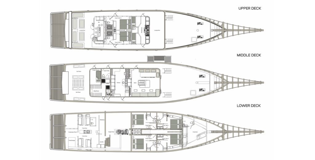Across both yachts, the layout prioritises space, privacy and airflow, reflecting a careful balance between comfort and the relaxed atmosphere that defines Siloina’s approach to surf travel.
